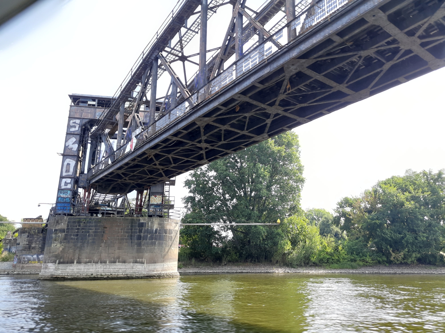 Nach etwa einer halben Stunde zeigte der Tiefenmesser nur noch 70 cm unter dem Boot an. Kurz darauf waren es nur noch 60 cm – und dann mussten wir stoppen. Trotz angehobenen Propellers erwischten wir einen größeren Stein. Als die Tiefe auf 50 cm sank, entschieden wir uns schweren Herzens zur Umkehr. Das Ziel Dessau würden wir dieses Jahr nicht erreichen. Dennoch: Rund 70 Kilometer hatten wir geschafft – ein gutes Stück!