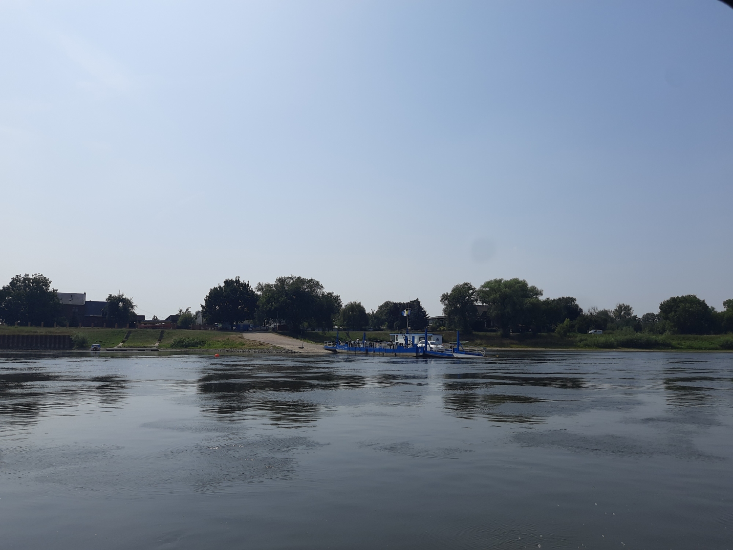 Die dritte Option war ein Restaurant auf einem alten Schiff – leider öffnete es erst mittags. Also fuhren wir weiter bis nach Barby. Dort hatten wir Glück: Ein freier Bootsstellplatz wartete auf uns. Nachdem wir die Fähre passieren ließen, „parkten“ wir ein.