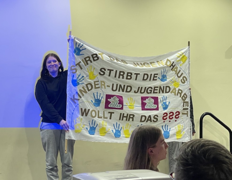 Anschließend informierte Bürgermeisterin Nicole Golz über die seit dem 22. August bekannten Zahlen der Schlüsselzuweisungen nach FAG (Finanzausgleichsgesetz) und die kurz- und mittelfristigen Auswirkungen auf die Gemeinde. Während der Ausführungen gab es immer Unruhe unter den Bürgern und Jugendliche brachten mit einem Transparent ihre Angst zum Ausdruck. „Stirbt das Jugendhaus – stirbt die Kinder und Jugendarbeit! Wollt ihr das???“ war darauf zu lesen.
