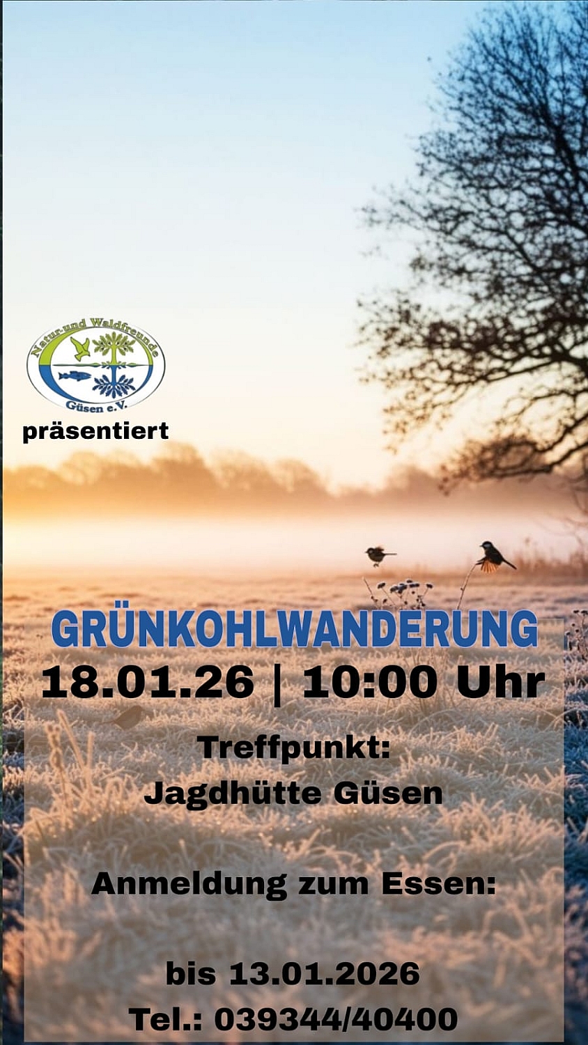 Die Wanderschuhe geschnürt und Appetit mitgebracht: Am Sonntag, den 18. Januar, lädt der Verein „Natur- und Waldfreunde Güsen e. V.“ zu seiner traditionellen Grünkohlwanderung ein. Naturfreunde und Gäste aus der Region können gemeinsam die winterliche Landschaft rund um Güsen erkunden.