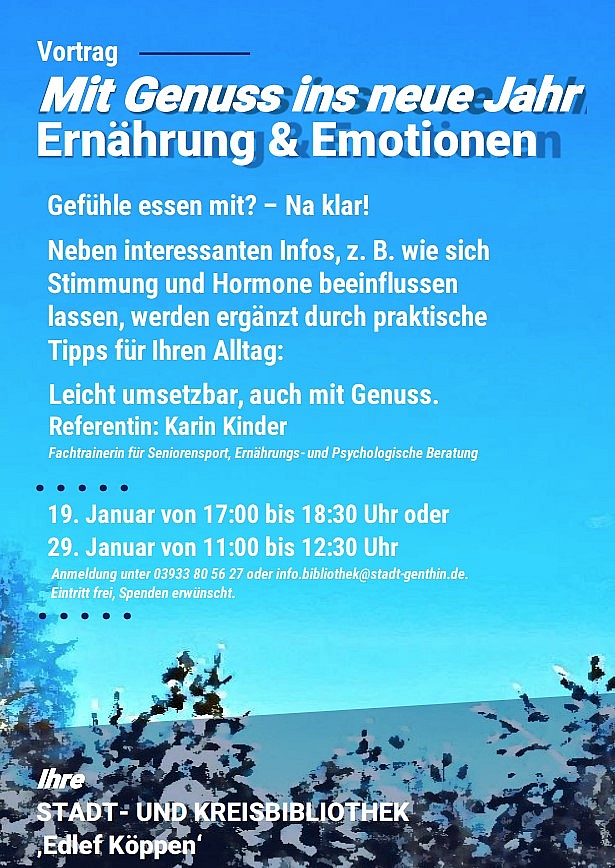 Warum greifen wir bei Stress zur Schokolade statt zum Salat? Dieser und weiteren Fragen geht die Stadt- und Kreisbibliothek „Edlef Köppen“ im Januar auf den Grund. Unter dem Titel „Mit Genuss ins neue Jahr – Ernährung und Emotionen“ beleuchtet die Referentin Karin Kinder das faszinierende Zusammenspiel von Hormonen, Gefühlen und unserem Essverhalten.