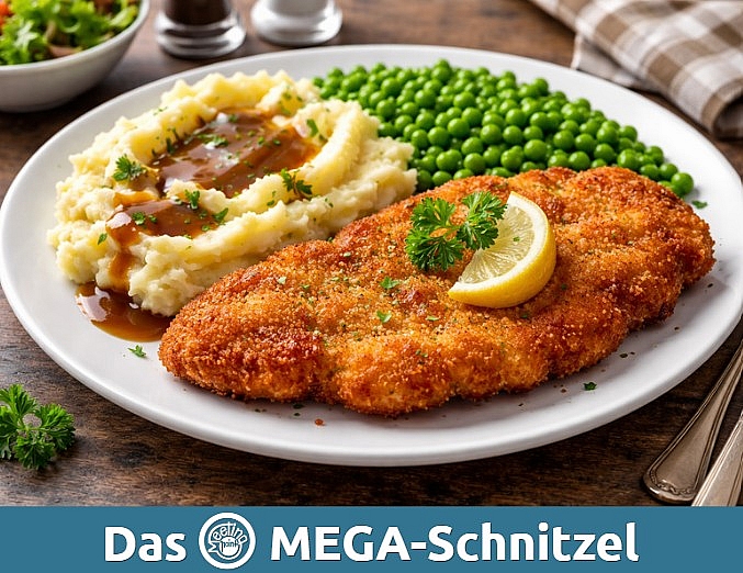 Rezepttipp: MEGA-Schnitzel mit Kartoffelbrei und Erbsen
