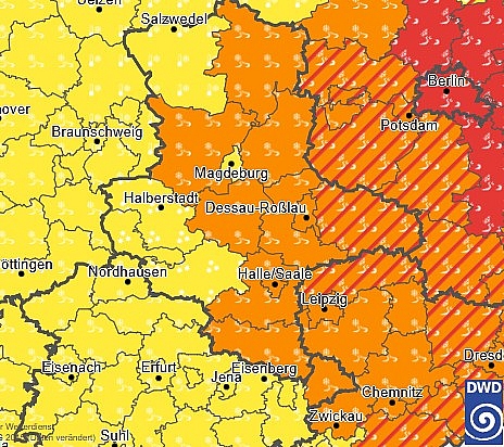 In der Nacht zunächst vom Erzgebirge bis in die Niederlausitz und nach Südbrandenburg erhöhte Glatteisgefahr durch gefrierenden Regen, Unwetter wahrscheinlich. Im Laufe der Nacht auch auf weitere Teile Sachsens und Brandenburgs sowie auf Sachsen-Anhalt ausweitend. Am Donnerstag im Osten und Nordosten weiterhin gebietsweise Gefahr von Glatteis durch gefrierenden Regen bei insgesamt aber langsam abnehmender Unwettergefahr.