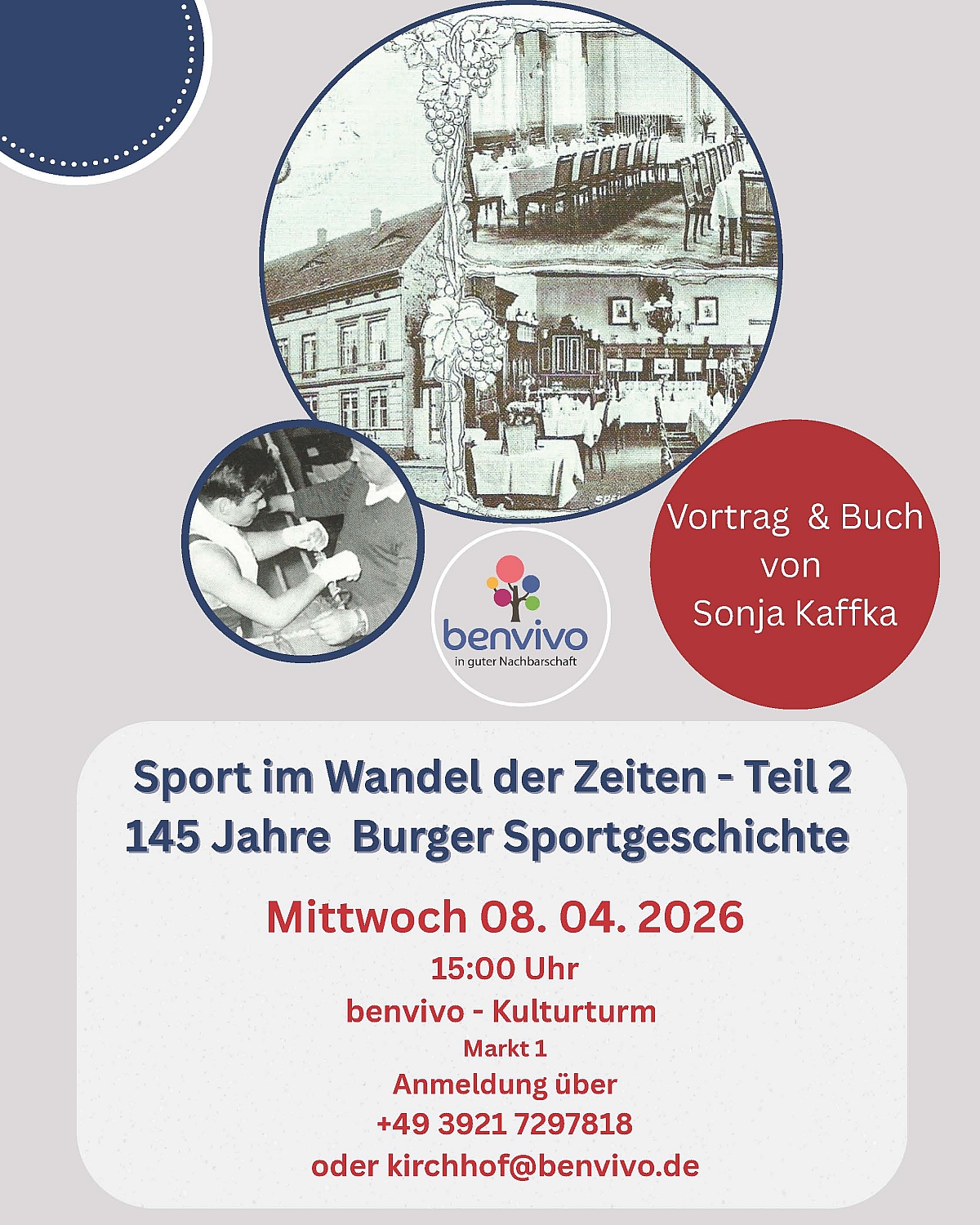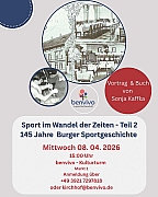 Vortrag und BuchvorstellungUnter dem Titel „Sport im Wandel der Zeiten – Teil 2“ lädt der Verein benvivo zu einer besonderen Zeitreise ein. Die Autorin Sonja Kaffka stellt dabei ihr aktuelles Vortrags- und Buchprojekt vor, das stolze 145 Jahre Burger Sportgeschichte beleuchtet.