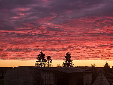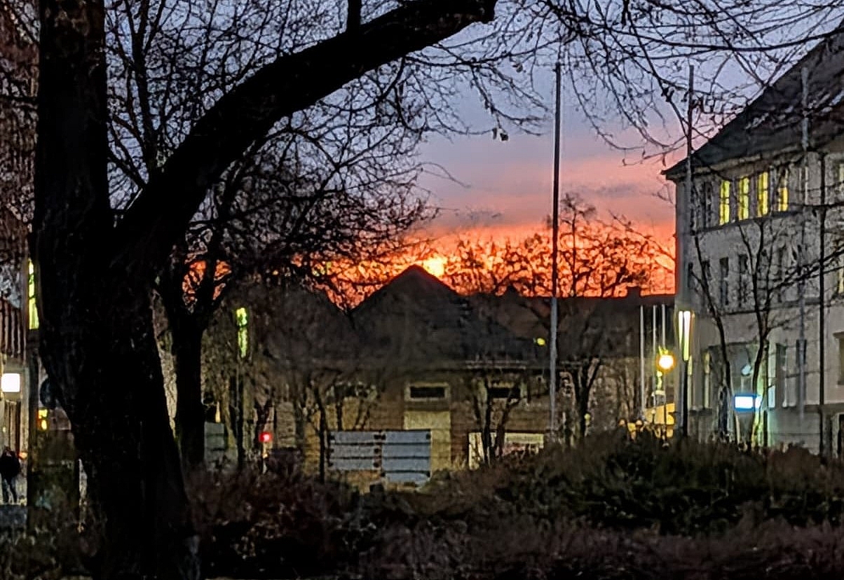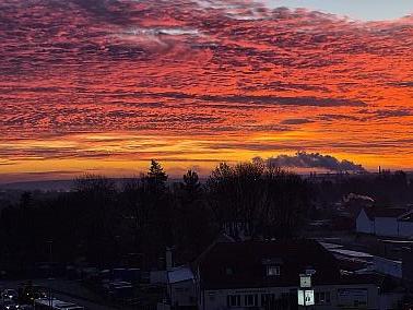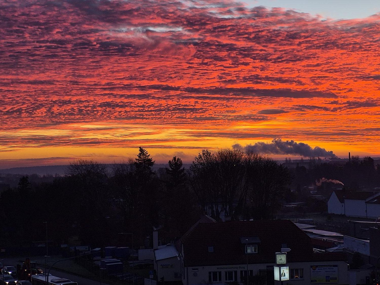 Na, wenn das kein Morgenrot ist. Ein Blick in den Südosten zum Gewerbegebiet, die dunkle Wolke, die sich als kleiner Berg andeutet, kommt vom Dampf aus der Papierfabrik. Unser Foto des Tages von Meetingpoint-Leser Hannes. Bewerbt euch auch für das Foto des Tages, im QUERFORMAT. Per Mail im JL an [info@meetingpoint-jl.de] oder per WhatsApp [ 0152- 52 640 109 ] und in Magdeburg an [info@meetingpoint-magdeburg.de] bzw. WhatsApp [ 01577 - 363 2109]