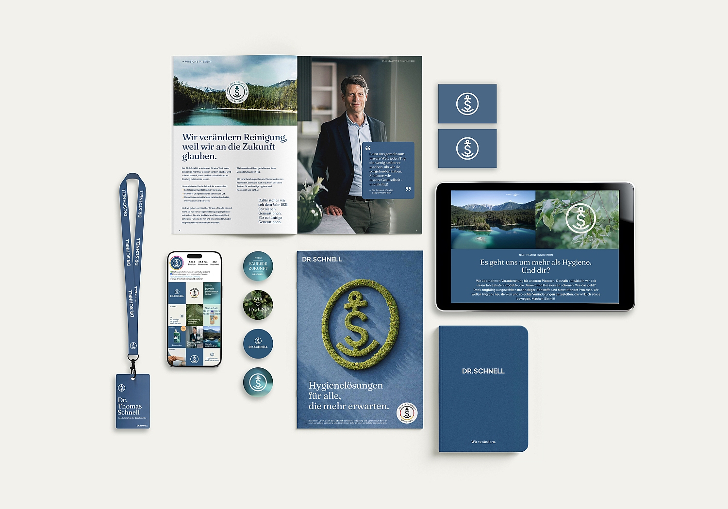 Die visuelle Neuausrichtung steht einerseits für die Innovationskraft und Zukunftsgewandtheit der Marke DR.SCHNELL und andererseits für das klare Ziel, sich als starker Partner für Kunden in Europa zu etablieren. Dennoch bricht das neue Brand Design nicht mit den bekannten und gelebten Werten des Unternehmens – ganz im Gegenteil: es zeigt eine klare, natürliche Gestaltung, die Nähe und Vertrauen ausstrahlt. Reduzierte Farben, ehrliche Typografie und eine ausdrucksstarke Bildsprache erzeugen einen Look, der bodenständig wirkt. Nachhaltigkeit und Kompetenz zeigen sich in einer ruhigen, menschlichen Ästhetik und dem modernen Verlauf.