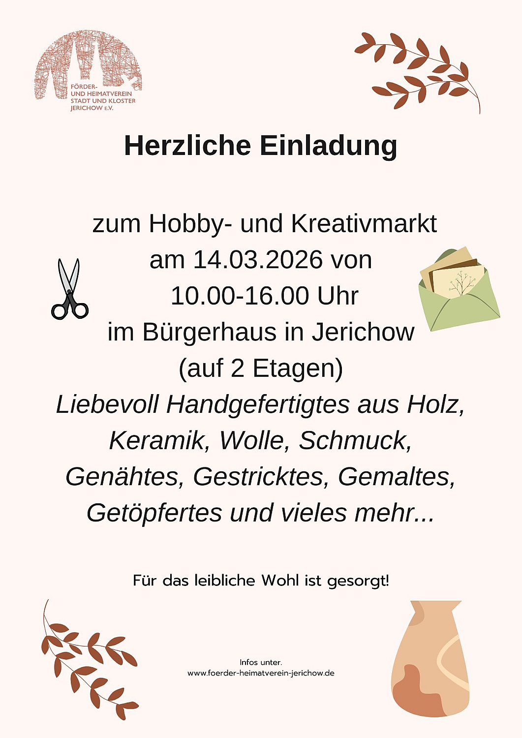 Der Förder- und Heimatverein Stadt und Kloster Jerichow e.V. lädt am 14. März zum nächsten Hobby- und Kreativmarkt nach Jerichow ein. In der Zeit von 10.00 bis 16.00 Uhr erwartet die Besucherinnen und Besucher im Bürgerhaus Jerichow (Karl-Liebknecht-Straße 55) ein vielfältiges Angebot auf zwei Etagen.