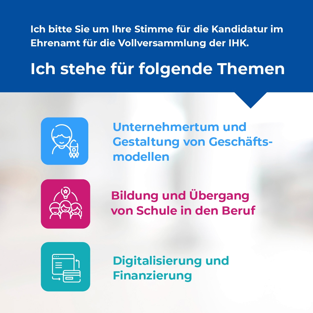 Nur wer aktiv mitmacht, kann etwas bewegen. Bitte nutzen Sie die Gelegenheit zu wählen und sprechen sie mich gerne an. Es gibt eine Vielzahl an Möglichkeiten sich bei der IHK im positiven Einzumischen! Bleiben Sie neugierig. Ich engagiere mich für unsere Region.